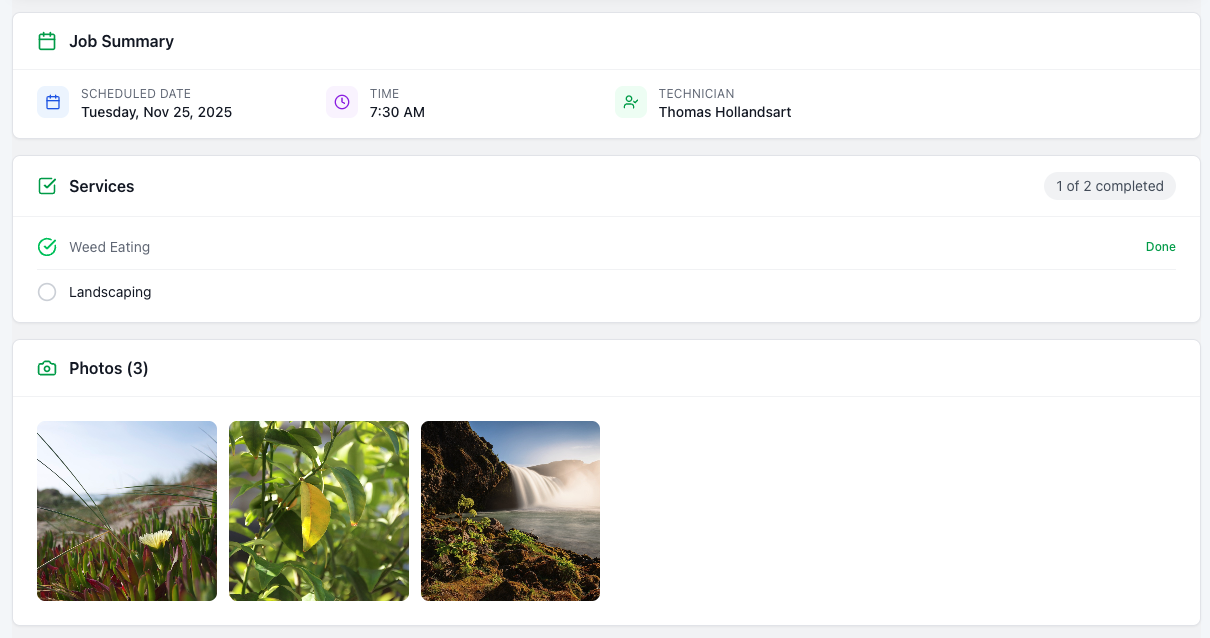 Crews mark jobs complete, add photos, and customers get automatic updates