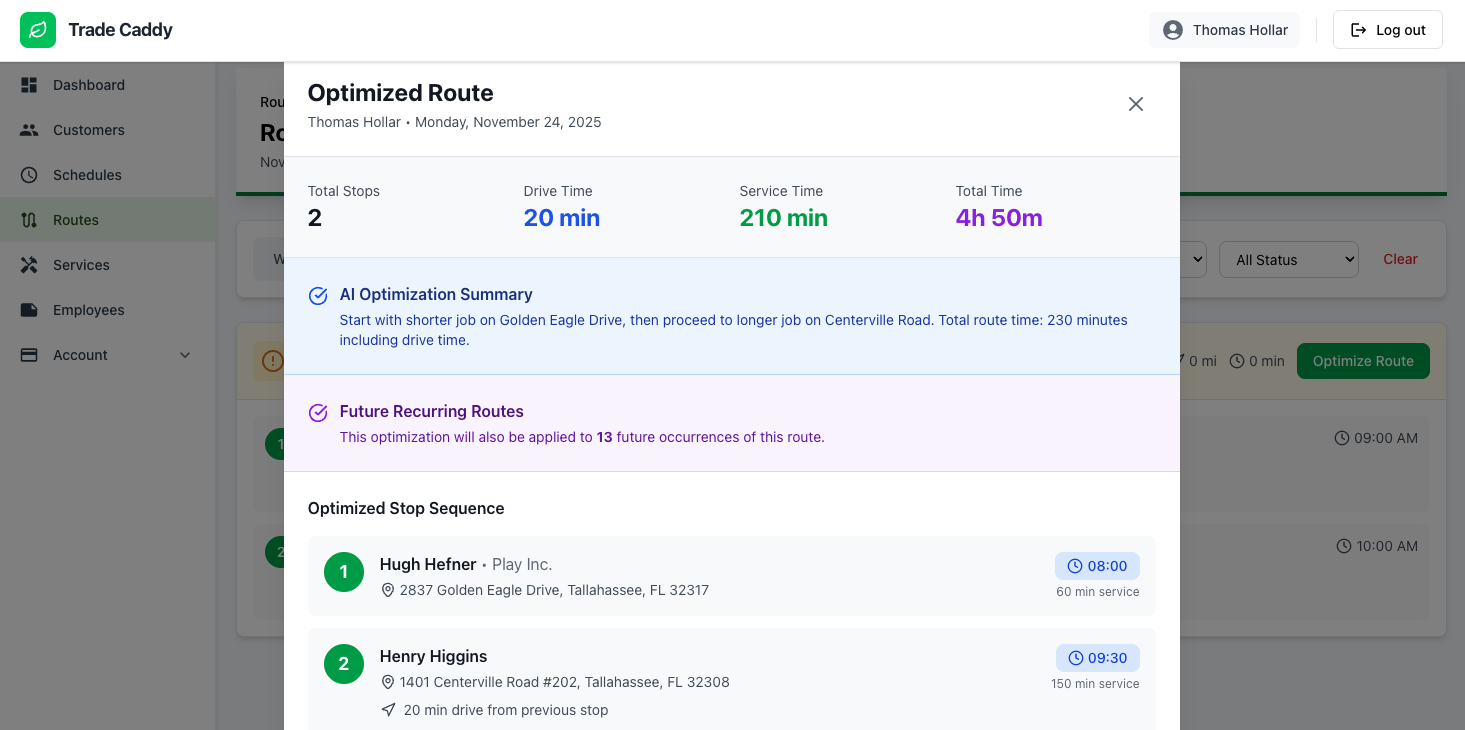 โTradeCaddy cut our scheduling time in half. The route optimization alone saves us 2 hours of drive time daily.โ