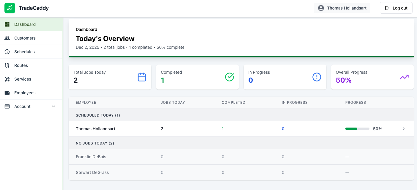 The all-in-one platform for scheduling, dispatching, and managing your trade business. From lawn care to HVAC โ if you run a crew, TradeCaddy has you covered.